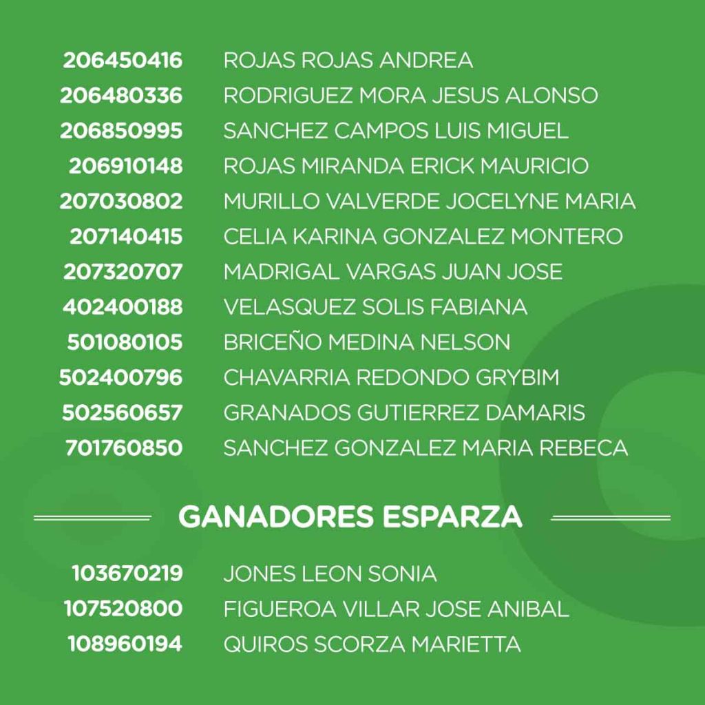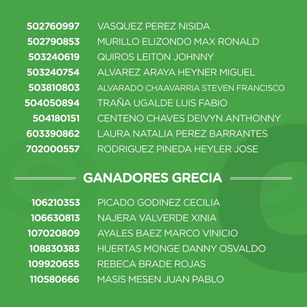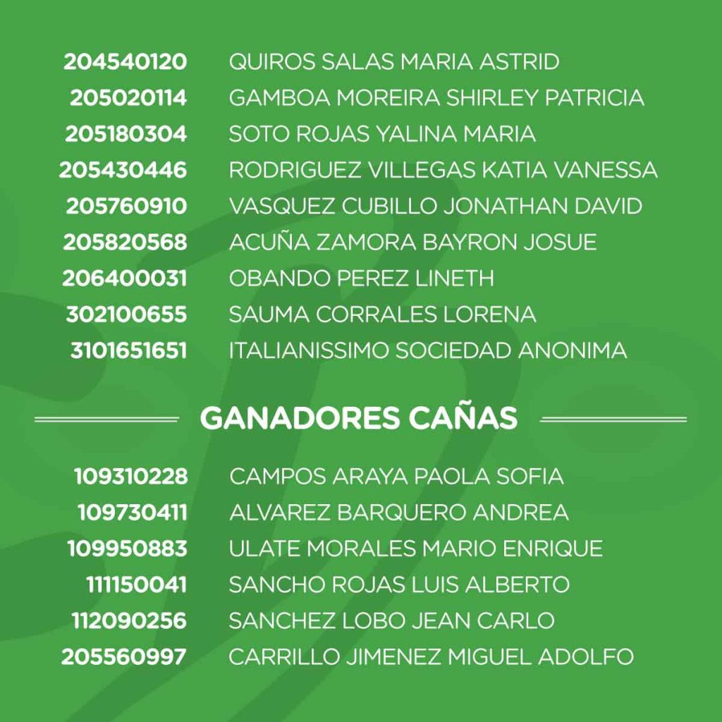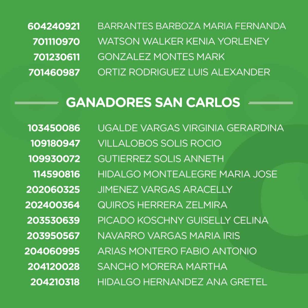 - El resultado de los ganadores(as) se dará a conocer en cada una de los puntos de venta; sea en Palmares, Esparza, San Carlos, Cañas y Grecia, mediante la publicación y exhibición de los nombres de cada uno de los mismos.