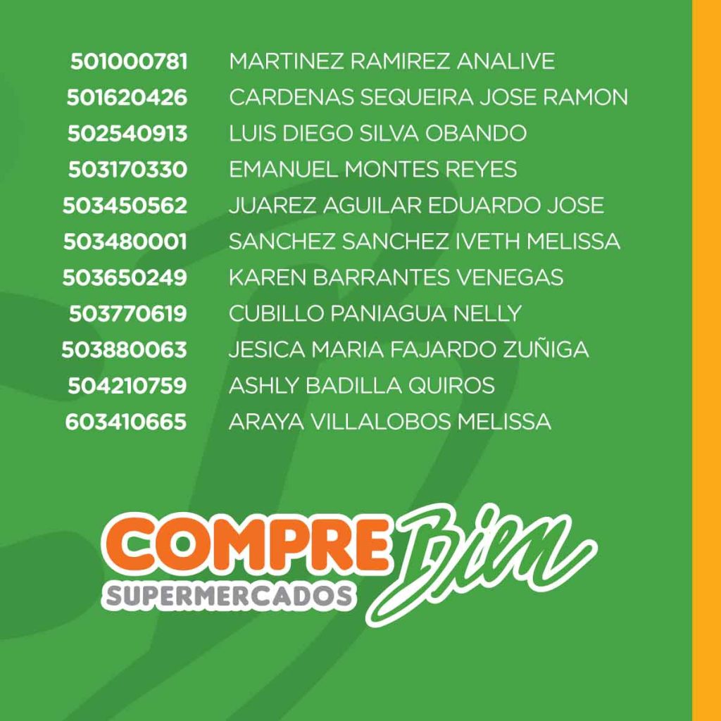 OCTAVO. DE LA ELECCION DE LOS GANADORES. La elección de los ganadores(as) del sorteo se realizará en la fecha estipulada en el punto sétimo del presente Reglamento, siguiendo la dinámica de seleccionar los ganadores (as) de los premios tomando los datos de las acciones electrónicas del Sistema de Información de la empresa, los cuales serán mezclados en forma digital mediante funciones aleatorias o “random” por el equipo de Tecnologías de Información de Supermercados Compre Bien y de entre el total de acciones electrónicas participantes computadas a nombre de la persona afiliada al programa de entre el 28 de abril de 2025 y el 30 de junio de 2025 En el sorteo se procederá a escoger aleatoriamente y al azar los números de acciones electrónicas favorecidas con la promoción, durante la vigencia de la promoción y en las fechas establecidas para cada sorteo, y se procederá a seleccionar a los ganadores. Cada ganador de la acción electrónica favorecida será contactado de forma inmediata, haciendo uso de los datos personales que ofreció al completar la hoja de afiliación al programa Cliente Frecuente Compre Bien; para constatar la identidad y los datos del ganador; y determinar si cumple con los requisitos para ser declarado ganador (a).