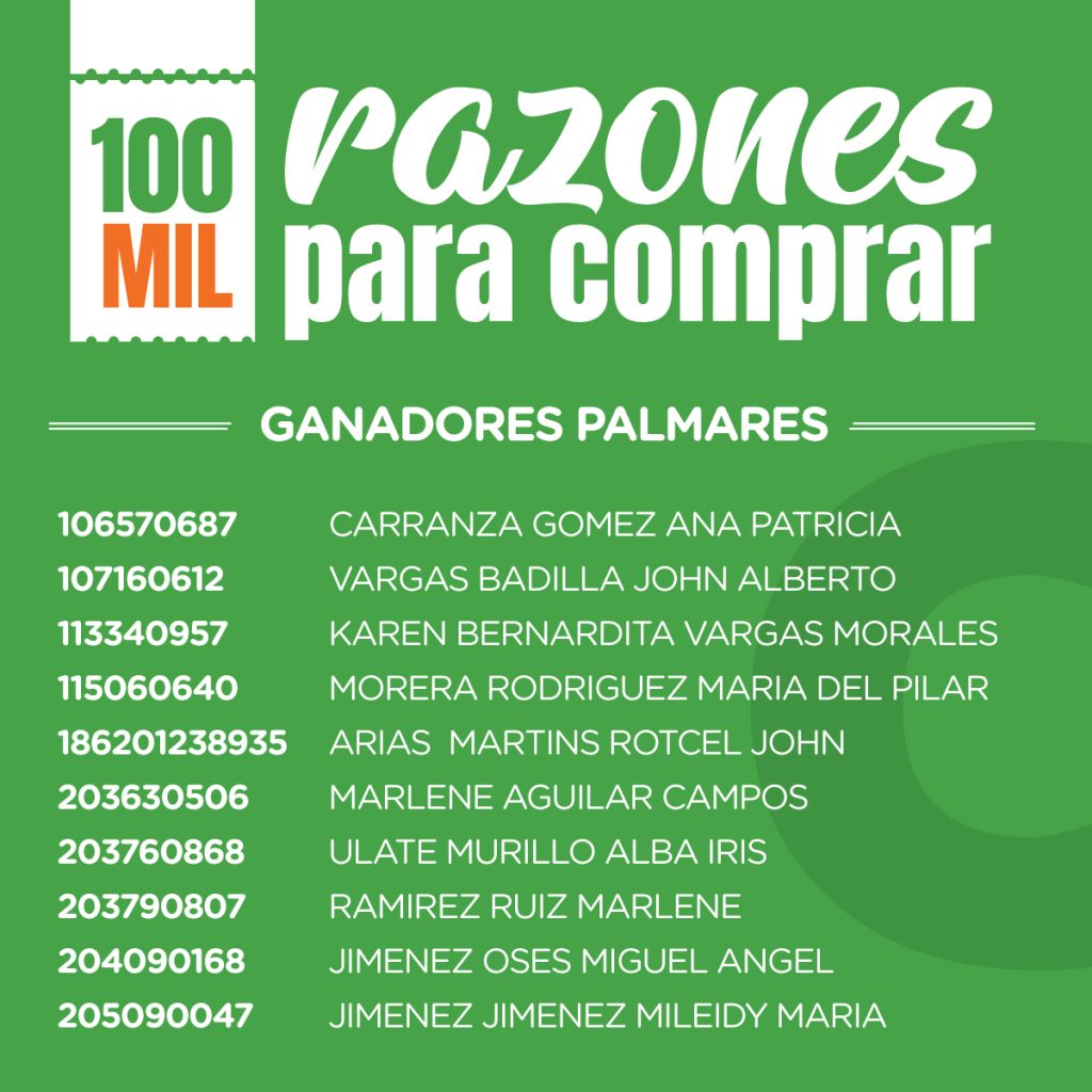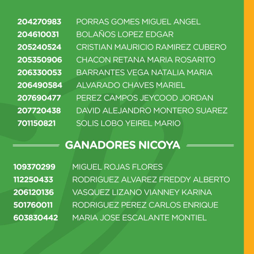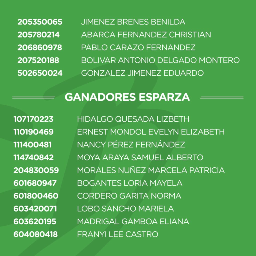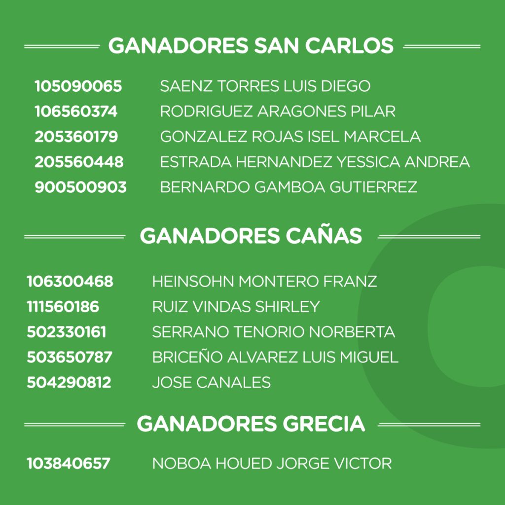 - El resultado de los ganadores(as) se dará a conocer en cada una de los puntos de venta; sea en Palmares, Esparza, San Carlos, Cañas y Grecia, mediante la publicación y exhibición de los nombres de cada uno de los mismos.